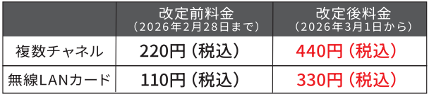 有料オプション料金改定のご案内(複数チャネル/無線LANカード)